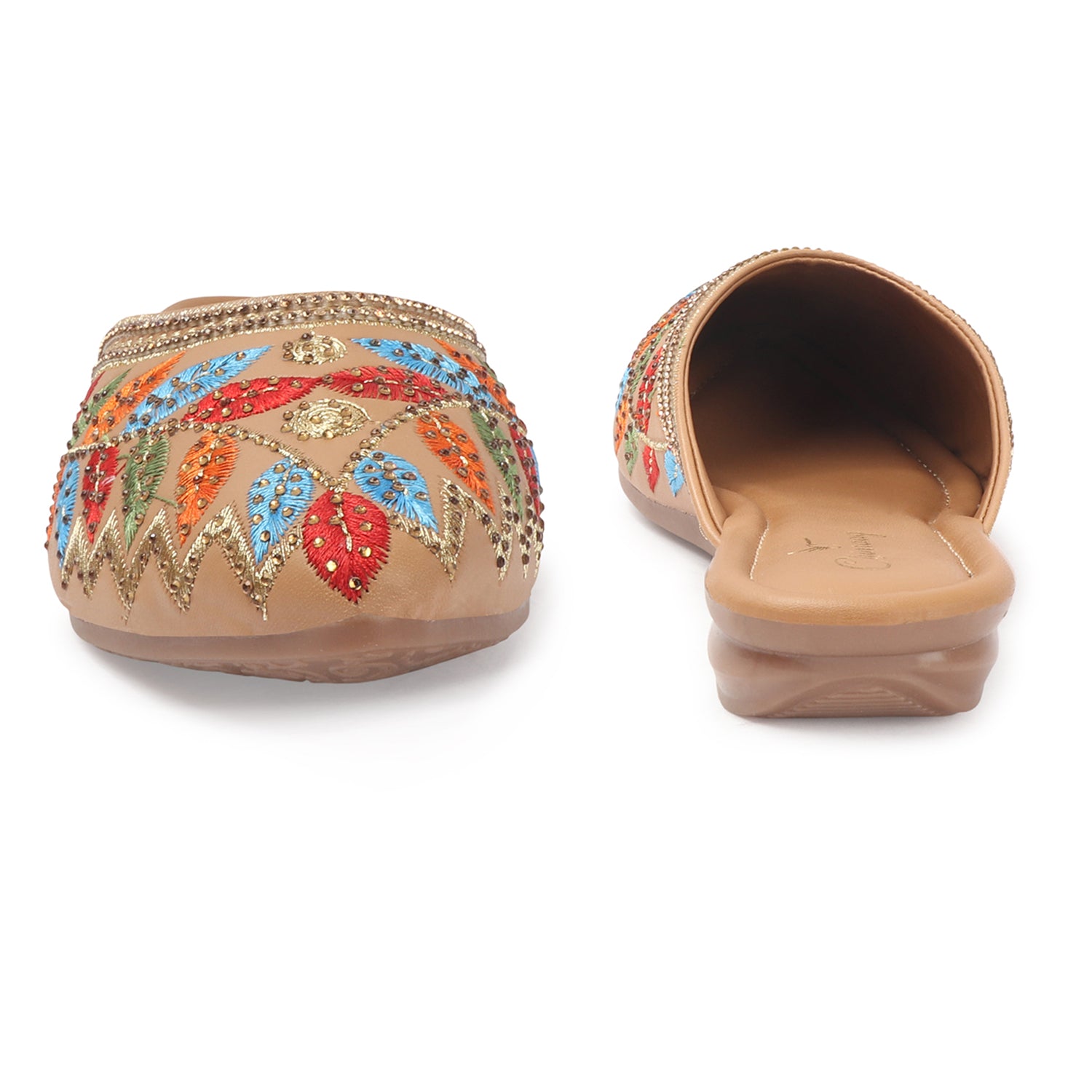 A touch of traditional elegance to your footwear collection with these beautifully designed ethnic mules. Featuring a pointed toe silhouette, these slip-on flats are adorned with intricate geometric embroidery in warm shades of rust, mustard, and beige. The delicate shimmer detailing along the criss-cross pattern enhances their festive appeal, making them perfect for special occasions.